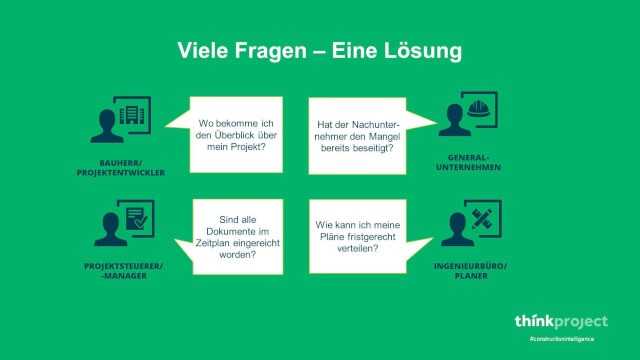 thinkproject ist ein weltweit führender Anbieter von Construction Intelligence-Lösungen. Um den Herausforderungen der Digitalisierung im Bauwesen zu begegnen, stellt das Unternehmen mit Hauptsitz in München innovative Softwarelösungen und strategische Beratung bereit, die dabei unterstützen das Potenzial von Menschen und Informationen in Bauprojekten zu erschließen.