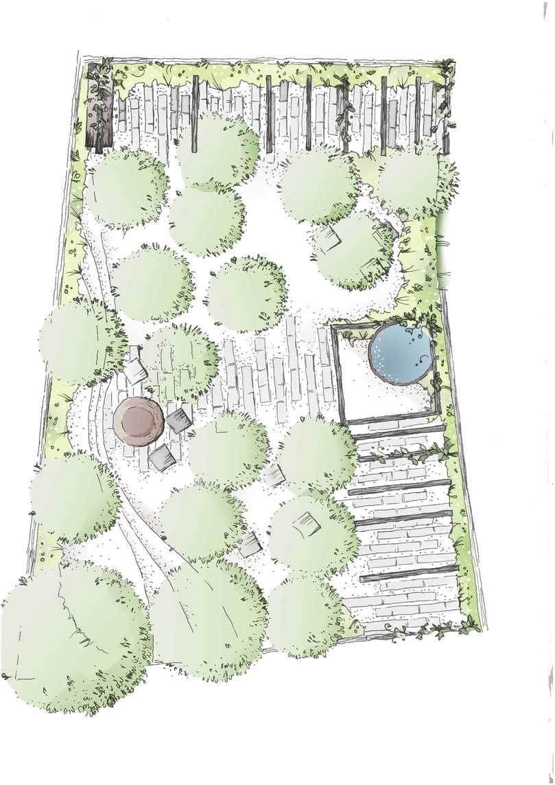 Die Anordnung der Holzrahmen verdichtet sich zunehmend, bis sie schließlich in einem offenen Holzkubus endet, an dem eine große Wasserschale aus Edelrost-Stahl platziert ist und der von kontrastreichen Staudenpflanzungen eingerahmt wird. Der Platz gibt den Blick auf eine geschwungene Treppenanlage frei. Die Stufen sind vorderseitig ebenfalls mit Edelrost-Stahl eingefasst und führen zu einer höher gelegenen Ebene. Eingebettet in den Schwung der Geländekante ist eine Feuerstelle mit Sitzmöglichkeiten. Am zweiten Eingang führt der Weg zu einem großen Stahlring mit integrierter Sitzbank. Sämtliche Gartenelemente sind von einem lichten Hain aus Birken umgeben.
