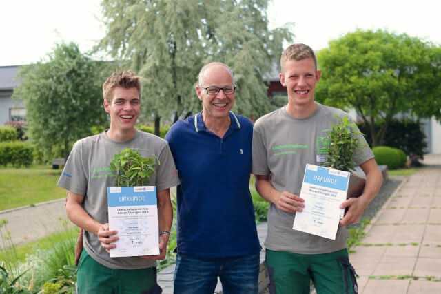 In Erfurt wetteiferten am 26. Mai neun Zweierteams an der Lehr- und Versuchsanstalt Gartenbau um den Landschaftsgärtner-Cup Hessen-Thüringen. Die Trophäe erhielten schließlich Felix Möller von der Firma Kimpel-Gärten, und Jannik Hohmann, Gebrüder Baier Garten- und Landschaftsbau. Die Zweitplatzierten Kevin Genzel, LGM Landschaftsbaugesellschaft Mühlhausen mbH, und Leonhard Kuge, Landschaftsgärtnerei Bielert GmbH, kommen aus Thüringen. Sabrina Hampl und Steffen Brehmer, Fichter GmbH & Co. KG aus Südhessen, schafften es als 3. auf das Treppchen. Gemeinsam mit Referatsleiter Steffen Groß aus dem Thüringer Ministerium für Infrastruktur und Landwirtschaft, überreichte Jens Heger, Präsident des Fachverbandes Garten-, Landschafts- und Sportplatzbau Hessen-Thüringen (FGL Hessen-Thüringen) die Urkunden an alle Teilnehmer.