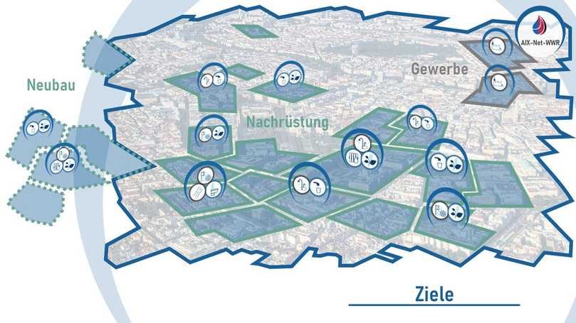 In der AIX-Net-WWR Stadt der Zukunft soll es standardisierte, semi-dezentrale Abwasserwiederverwendungssysteme auf Quartiersebene mit innovativen Einzeltechnologien geben, die die genannten Probleme lösen. Semi-dezentral bedeutet dabei, dass mehrere Gebäude an ein System angeschlossen werden. Die Vorteile von semi-dezentralen Systemen liegen insbesondere in der engen räumlichen Verknüpfung von Abwasseranfall und -behandlung. Dadurch werden die direkte Wiederverwendung und Nutzung des aufbereiteten Wassers und der im Abwasser vorhandenen Energie direkt an Ort und Stelle des Abwasseranfalls ermöglicht, und zwar ökologisch und ökonomisch optimiert.