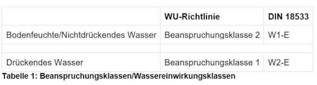 Es sei angemerkt, dass in der DIN 18533 in seiner Wassereinwirkungsklasse W2-E nicht mehr nach einer zeitlichen Einwirkung differenziert wird, sondern nur noch nach der Höhe des Wasserdruckes. Somit muss bei der Planung und Ausführung einer Abdichtung von erdberührten Bauteilen differenziert werden, ob das Wasser einen hydrostatischen Druck (drückendes Wasser) ausübt oder nicht (nichtdrückendes Wasser).